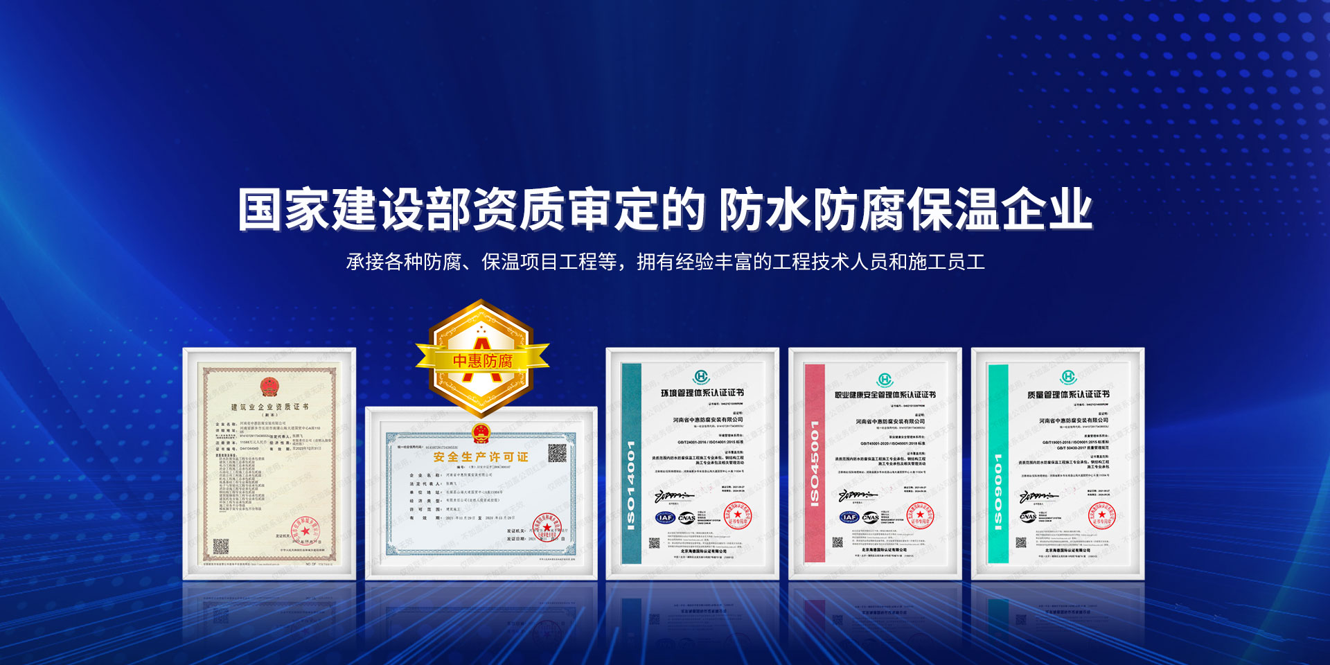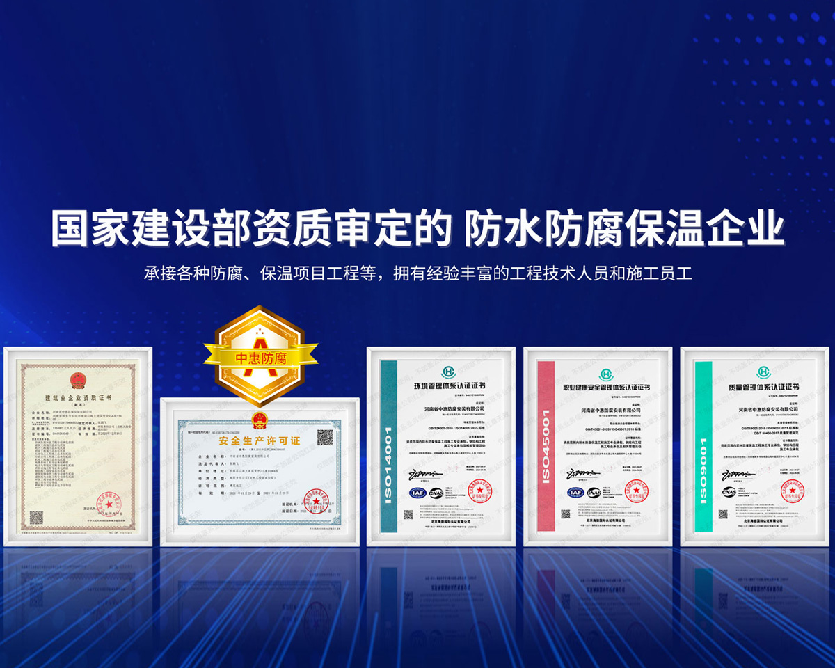 公司經營范圍:防水防腐保溫工程;消防設施工程;建筑裝修裝飾工程;建筑機電安裝工程;電力工程;建筑工程;石油化工工程;工業清洗工程;油罐清洗工程;鋼結構工程;環保工程;模板腳手架工程;電纜防火封堵、防污閃噴涂、外墻外保溫工程;各類施工勞務作業;設備維修、船舶鉚焊、涂裝;電力工程材料、建材、防水材料、防火材料、防腐保溫材料銷售,并相繼通過了GB/T19001-2008idtISO9001:2008GB/T50430-2007質量管理體系認證證書。GB/T24001-2004idtISO14001:2004環境管理體系認證證書。GB/T28001-2011idtOHSAS18001:2007職業健康安全管理體系認證證書。公司是中國防腐蝕于防護協會、中國施工企業管理協會、電力協會和中國鋼結構防水協會會員單位。 公司的經營業務涵蓋了石油、化工、電力、冶金、煤炭、船舶、國防、燃氣、水利、環保、交通運輸、航空及國防軍工和輕紡市政等行業的防腐保溫絕熱設備。鋼結構安裝、防火、防水、金屬噴鍍、聚脲噴繪、陰極保護、防滲透堵漏、玻璃鋼及各種磚版材料襯里、橡膠襯里、煙氣硫和耐酸溶劑腐蝕等工程施工。公司連續十年榮獲“省市先進施工企業”“安全生產先進單位”“重合同,守信用企業”和“AA***資質企業”的稱號。2000年被命名為市級文明單位,2002年被國家工商行政管理局命名為“重合同,守信用的企業”、被中國工業防腐蝕技術協會命名為“防腐蝕企業,能源節約及環境保護領域有豐富的經驗和***的業績。工程一次交驗合格率100%。其中攀枝花鋼鐵公司煉鐵廠四號高爐及熱風爐防腐工程、上海寶鋼公司煤氣柜防腐工程、撫順石油一廠裝置防腐項目、齊魯石化公司稀烴廠高塔防腐工程、吉林化學工業公司煉油廠油罐防腐工程、天津石化熱電廠六號爐頂棚聯絡管保溫工程、大慶油田(太倉)力神泵業工程、中國化學工程第十一建設工程、中原油田勘探局工程、中國石化銷售有限公司華北分部、魯皖輸油管道工程、貴州開磷息烽合成氨工程、陜西黃陵煤化工程、中國石油天然氣西部管道塔里木輸油工程、邯鋼集團邯寶鋼鐵公司煉鐵工程、德州供電工程、吉寶(南通)船廠工程,偃師華潤熱力工程、鄭州熱力總公司。 河南省中惠防腐安裝有限公司愿以豐富的施工經驗,***的技術,***的設備,***的管理,***的服務,竭誠為國內外廣大的用戶提供***滿意、******的工程作品。 我公司愿與國內外同仁一道,團結協作,共同推進防腐蝕行業發展! 公司地址:河南省長垣縣建設路北段360號 固定電話:0373-8866488 郵編:453400 網址:http://www_zhff_com_cn.yihaoniu.com